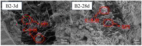 Figure 7 and Figure 8 display micro-pores, primarily a result of the cementitious material’s heterogeneous hydration process. The hydration of SWBC started from some fragments. The hydration of sulfates was relatively fast, and there was “flash setting”. Some hydration products were generated within the first ten minutes of hydration [57]. With ongoing hydration, the hydration products gradually appeared at the top of the dehydrated particles and gradually enveloped the particles, forming aggregates [57]. In the later stage of hydration, thick layers were formed, resulting in a solid structure [57]. Figure 7 and Figure 8 display micro-pores, primarily a result of the cementitious material’s heterogeneous hydration process. The hydration of SWBC started from some fragments. The hydration of sulfates was relatively fast, and there was a “flash setting”. Some hydration products were generated within the first ten minutes of hydration [57]. With ongoing hydration, the hydration products gradually appeared at the top of the dehydrated particles and gradually enveloped the particles, forming aggregates [57]. In the later stage of hydration, thick layers were formed, resulting in a solid structure [57].