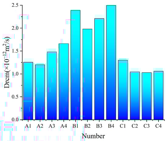 Given the slow hydration rate of SWBC, the chloride ion diffusion coefficient was tested at 56 days. Figure 9 demonstrates that the chloride ion diffusion coefficient of SWBC is less than 3 × 10−12 m2/s. Analysis of chloride ion diffusion coefficients revealed that Group B exhibited a higher coefficient compared to other groups.