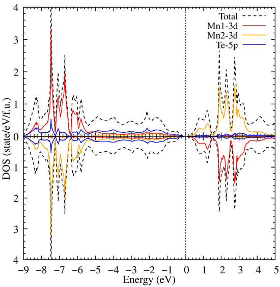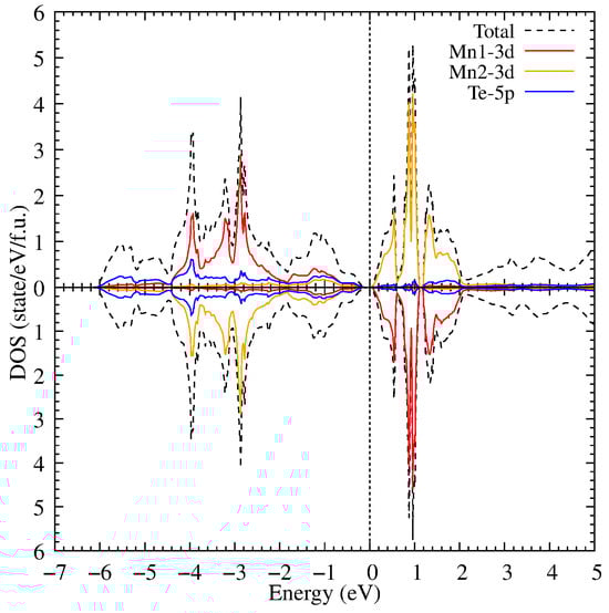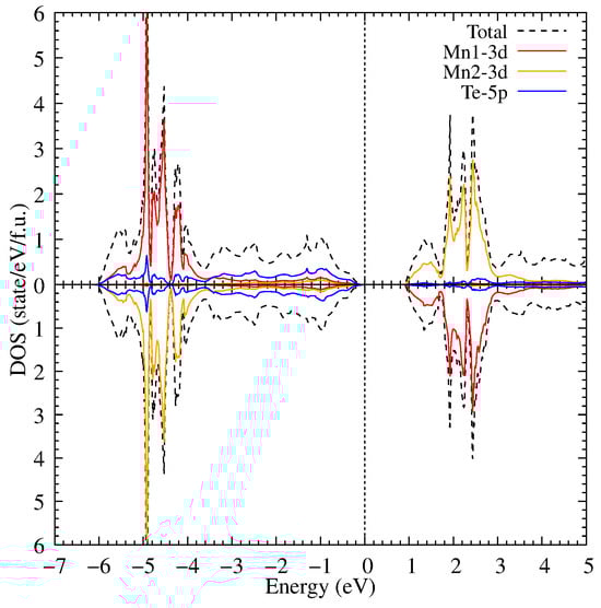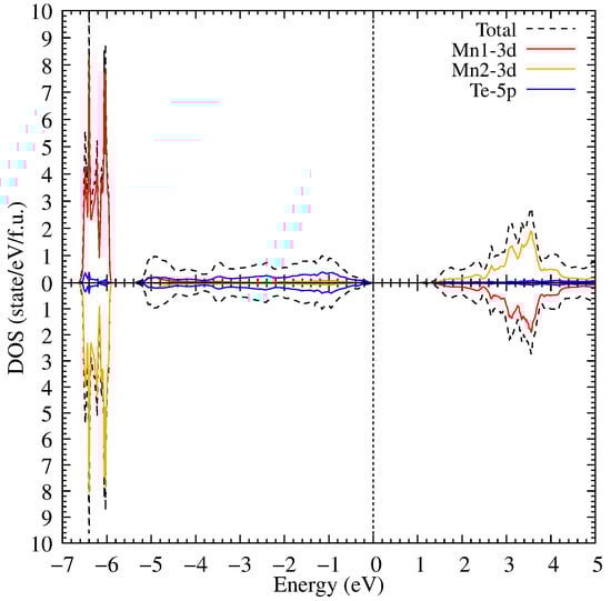After increasing the U value up to 6.9 eV, the bandgap width is increased slightly in comparison with U = 3 eV, see Figure 5. The Mn 3d states separated from the Te 5p ones in the valence band form a gap between −5.8 and −5.2 eV. And now the Mn 3d states are located between −5.8 and −6.6 eV with the higher peak intensity than in the previous calculation. This means that the main part of the Mn 3d states in the valence band is shifted to an area of −5.8 to −6.6 eV. In addition, a small part of the Te 5p hybridized states is shifted together with the Mn 3d states. The obtained DOS is in good agreement with the experimental photoemission spectra [41] where the occupied states are found just below 0 and a pronounced peak between −7 and −6 eV. The Mn 3d of the conduction part are moved by 1 eV to the above energies. This leads to the bandgap width increase because these states are found above 1.25 eV in the conduction part; notable, the Te 5p limit the bandgap in the valence band. The position of these states is also in agreement with the experimental photoemission spectra [41] having the main contribution of the Mn states between 3 and 4 eV.