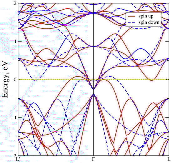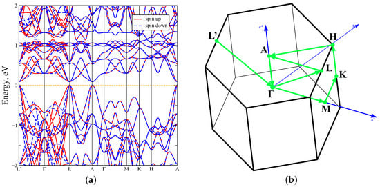 Figure 3a demonstrates the band structure in the L’––L–A––M–K–H–A direction of MnTe in the GGA approximation. Also the MnTe Brillouin zone with the direction of the bypass high-symmetry points is demonstrated in Figure 3b. The red lines indicate the spin up projection, blue dot lines–the spin down projection. It is seen, that bands in the spin up and down projections are matched in the direct L–A––M–K–H–A intervals, which indicates antiferromagnetic nature. But a spin splitting as a result of the broken time-reversal symmetry () is observed in the reverse L’––L direction. For this reason, the spin up and spin down projections are mirrored but indicate the ferromagnetic nature. All these facts confirm that MnTe exhibits altermagnetic properties.The bandgap width is equal to 0.2 eV due to the presence of states in the vicinity of the Fermi level at L’, L and A high-symmetry points. In turn, at the other high-symmetry points, such as , the direct energy gap width is 1 eV. Also the bandgap width achieves 1.75 eV at the H point.