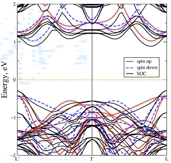 Also, we performed calculations taking for account spin-orbit coupling together with Coulomb parameter equal to 6.9 eV, see Figure 6. Taking SOC into account does not result in noticeable changes in the states, and the bandgap decreases slightly by 0.2 eV. This effect is comparable with a bandgap change of 0.12 eV when the exchange-correlation functional LSDA is replaced by GGA-PBE in the calculations. The energy of SOC for the Mn ions is equal to −0.008 eV, and for the Te ions it is −0.189 eV. It is clear that the Te SOC energy is much higher than the Mn SOC energy.