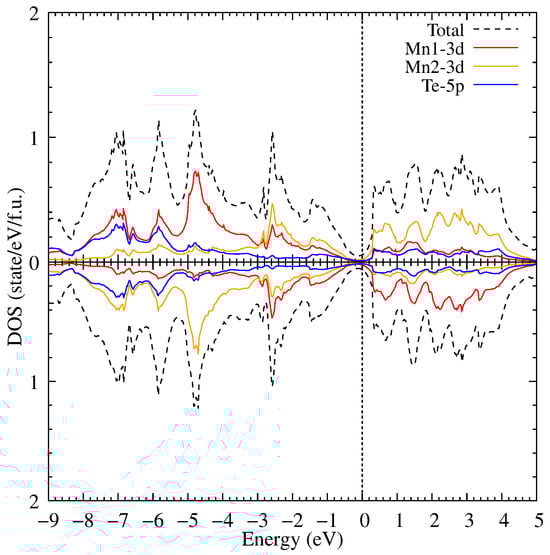 With a further decrease of volume to 50% (see Figure 8) of the initial volume, the gap is closed and an insulator-metal transition occurs. The intensities of the Mn 3d states decrease significantly, and the Mn 3d–Te 5p states strong hybridization is observed. The band structure presented in Figure 9 overlaps at the point at the Fermi level with a large altermagnetic spin splitting.