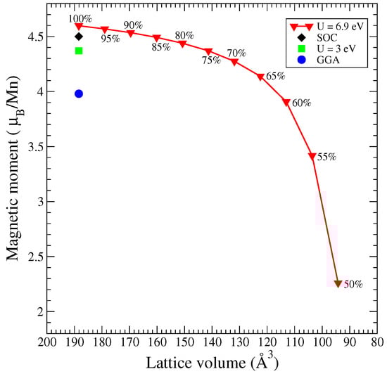Because MnTe exhibits altermagnetic properties, the total magnetic moment for it is equal to zero Bohr magnetons, as the magnetic moment of the Te ions. However, the Mn magnetic moment has a high value in all our computational methods; see Figure 11. Thus, the Mn magnetic moment is equal to 3.98 in the GGA calculation. As the Coulomb parameter increases to 3.0 eV, the magnetic moment of manganese increases to 4.37 . At the maximum value of the Coulomb parameter 6.9 eV [20,35], the Mn magnetic moment reaches 4.6 , which is characteristic for the high spin state. The Mn magnetic moment in the case of a calculation with SOC is equal to 4.5 . Furthermore, with a decrease in the volume of the MnTe cell, the Mn magnetic moment decreases. Under compression, the energy bands expand, and as a result, the magnetic moment on Mn decreases. When volume of 50% is reached (with the Mn magnetic moment of 2.26 ), a transition into a low spin state is finished.