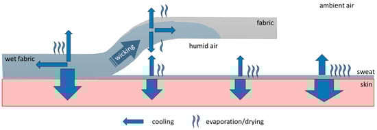 Physical activity and/or exposure to warm or hot conditions induces sweating. Some of the sweat is absorbed by the clothing fabric and evaporates from there; evaporation of sweat from the fabric rather than from the skin may lead to a lesser body cooling effect, due to the distance between the fabric and the skin, and may also lead to a delay in cooling due to the difference in evaporation rates from the bare skin and the structure of the fabric [1] (Figure 1). Finally, the sweat moisture picked up by the garment may be accumulated in the clothing if the sweat production rate is greater than the evaporation rate over a period of time, and this may lead to continuous cooling of the body even after the secretion of sweat has ceased and cooling is no longer needed from the point of view of thermoregulation. This effect is commonly called post-exercise chill and is typically to be avoided, especially when exercising in cold conditions. Besides issues related to cooling, the accumulated moisture may lead to so-called wet discomfort due to the dampness and clinginess of clothing [2,3,4,5,6,7,8,9].
