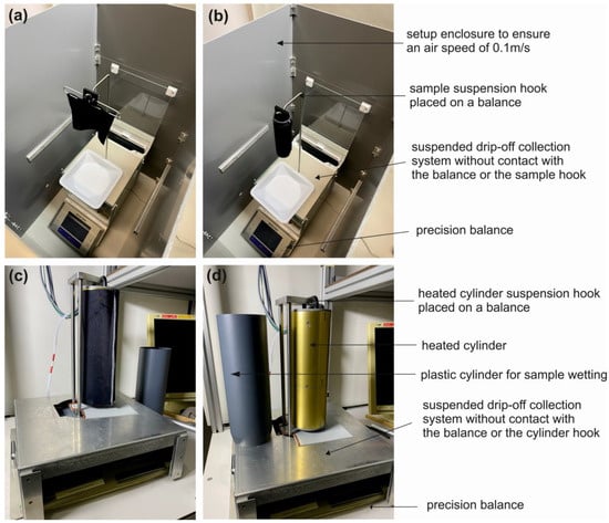 A heated cylinder (with a diameter of 10.2 cm and a height of 28 cm) was used to carry out a one-sided drying test on a heated surface (Figure 2d). A brass cylinder was heated electrically with four heating foils on the inner side of the brass cylinder shell. Four Pt100 sensors built onto the cylinder surface were used to measure the surface temperature with a calibrated accuracy of 0.05 °C. The drying test was run with the cylinder set at a constant surface temperature of 35 °C, and variable heating power was needed to maintain this temperature. The entire cylinder was suspended on a balance (Mettler SM 1220, Mettler-Toledo, Switzerland; precision: 0.1 g), allowing for separation of the sample mass and the dripped-off water mass.
