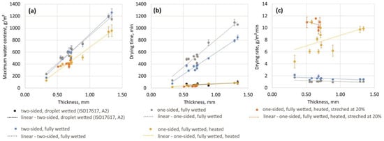 Correlations between (a) maximum water content, (b) drying time, and (c) drying rate in relation to fabric thickness for all fabrics and all methods.