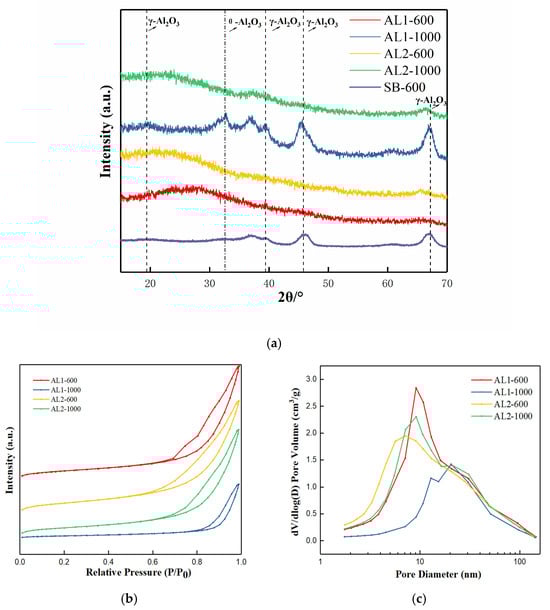AL1 and AL2 denote non-modified alumina and silicon-modified alumina, respectively. SB-600 was the sample SB (Sasol boehmite) calcined at 600 °C for 2 h. Figure 1a illustrates the characteristic peaks of γ-Al2O3 for AL1-600 and AL2-600, which were observed at 2θ values of 39.4° and 67.2°, corresponding to the (2 2 2) and (4 4 0) crystal plane reflections of γ-Al2O3 (JCPDS No. 10-0425) [22]. After calcination at 1000 °C, AL1-1000 showed transformation to the θ-Al2O3 phase (JCPDS, No. 11-0517) [20], demonstrating the occurrence of crystalline transformation. However, a significant observation was that AL2-1000 did not undergo this transformation to the θ-phase even under such harsh calcination conditions in air. This suggested a significant improvement in the thermal stability of silicon-modified alumina.