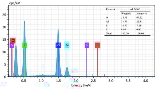 The sample exhibited a type IV adsorption/desorption isotherm, indicating a mesoporous structure, as illustrated in Figure 1b. As shown in Figure 1c, AL1-600 displayed a relatively concentrated pore size distribution, with a most probable pore size of 10 nm. In contrast, AL2-600 exhibited a most probable pore size of 6 nm, with a relatively broad distribution. After calcination at 1000 °C, the most probable pore size of AL2-1000 was 8 nm, and the most probable pore size of AL1-1000 was 20 nm. As summarized in Table 1, the specific surface areas and pore volumes of AL1 and AL2 exceeded those of SB-600. Specifically, the specific surface area of AL1-600 attained 540.5 m2/g but decreased to 173.5 m2/g after calcination at 1000 °C. In contrast, the specific surface area of AL2-1000 remained at 496.0 m2/g, indicating its superior thermal stability compared to others [20,22,25]. It can also be observed from the EDS characterization in Figure 2 that silicon has been successfully loaded onto the modified alumina. The aforementioned phenomena were attributed to the fact that the reverse precipitation method formed smaller nuclei compared to the conventional method, resulting in a larger specific surface area for the synthesized alumina, as illustrated in Figure 3. Additionally, doping with Si enhanced the thermal stability of alumina.