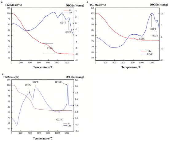 BO1 and BO2 represented non-modified boehmite and silicon-modified boehmite, respectively. The phase transformation route in the range of 200–1400 °C was as follows: γ-AlOOH → γ-Al2O3 → θ-Al2O3 → α-Al2O3 [27]. An exothermic peak observed at approximately 1091 and 1235 °C is likely attributed to the γ-Al2O3 to θ-Al2O3 and θ-Al2O3 to α-Al2O3 transformations for BO1, as shown in Figure 4a. The corresponding exothermic peaks for SB materials are 1032 and 1219 °C, as shown in Figure 4c. However, for BO2, the corresponding endothermic peaks for these phase transitions shifted to 1192 °C and 1302 °C, as shown in Figure 4b. Simultaneously, during the dehydroxylation process after 600 °C, the weight loss observed for AL2 was markedly lower, totaling only 1.56%, in contrast to the 8.76% weight loss for AL1. These results demonstrate that the incorporation of silicon significantly alters the phase transformation temperatures of Al2O3. This phenomenon was attributed to the formation of a protective silicon layer on the alumina surface during the dehydroxylation stage, arising from the replacement of some Al–OH groups with silicon. Consequently, the sintering process was delayed, as illustrated in Figure 5.