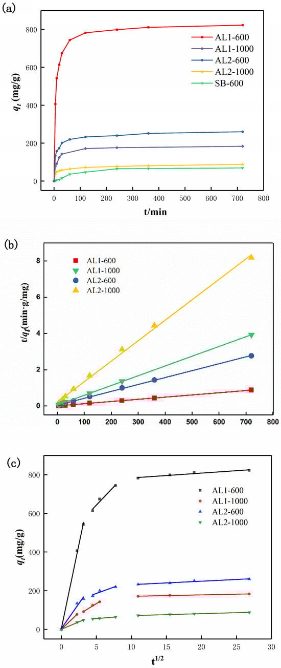 The adsorption capacity–time curve of CR was investigated, with an initial CR concentration of 400 mg/L and an adsorbent concentration of 0.1 g/L. As shown in Figure 7a, SB-600 exhibited the lowest adsorption capacity for CR, reaching a maximum of only 69.9 mg/g within 360 min. Due to its limited adsorption capacity, SB-600 will not be further discussed. Conversely, AL1-600 demonstrated the highest adsorption capacity for CR, achieving 822.6 mg/g. However, with the introduction of silicon, the adsorption capacity of AL2-600 declined significantly to 260.3 mg/g. In accordance with the specific surface area data in Table 1, AL2-600, with its higher specific surface area, exhibited lower adsorption capacity compared to AL1-600. This discrepancy is attributed to the introduction of silicon, which occupied the active sites on the surface of alumina.