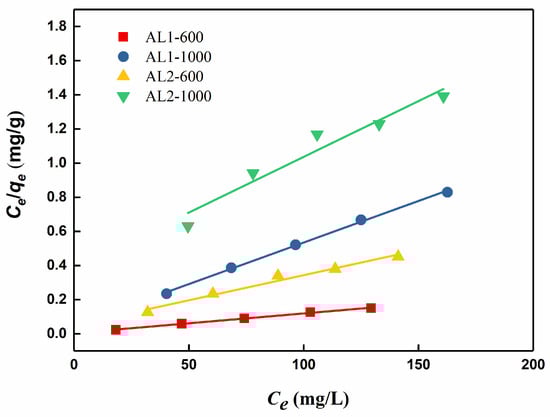 To investigate the impact of the initial CR solution concentrations on adsorption performance, a series of experiments were conducted. Specifically, the adsorption experiments were performed at a stirring speed of 400 rpm, with an adsorbent dose of 0.1 g/L. The CR solution was initially prepared at a concentration of 600 mg/L and then diluted to achieve concentrations of 500, 400, 300, and 200 mg/L, respectively. The experimental data obtained were subsequently fitted to the Langmuir, Freundlich, Temkin, and Dubinin–Radushkevich isothermal adsorption models, which are described by the corresponding equations (Equations (3)–(7)).