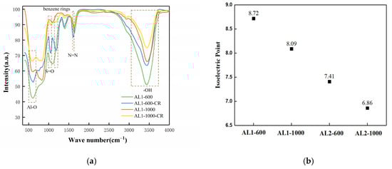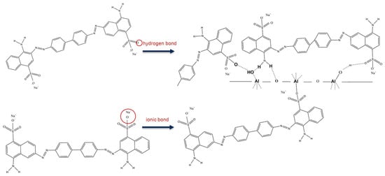 As depicted in Figure 9a, AL1-600-CR is denoted as AL1-600 after adsorption. AL1-600 and AL1-600-CR showed peaks at 1046 and 1160 cm−1, which are assigned to the stretching vibration of S=O and benzene rings, respectively [24]. The broad band centered at 1604 cm−1 refers to the stretching vibration of the N=N stretching of the azo group. Notably, the peak intensity corresponding to the hydroxyl group at approximately 3400 cm−1 in AL1-600 was markedly stronger than that observed in AL1-600-CR. Furthermore, the attenuation of stretching vibration peaks at approximately 600 and 800 cm−1 suggests the involvement of hydroxyl groups on Si-O and Al-O in the adsorption process. This trend was also observed for AL2-600 and AL2-1000. Additionally, as shown in Figure 9b, AL1-600 possessed the highest isoelectric point among all the samples. The isoelectric point of alumina is highly dependent on the surface hydroxyl groups [30]. A high isoelectric point indicates many hydroxyl groups, resulting in more active sites on the surface. When γ-Al2O3 is dissolved in water, it forms surface hydroxyl groups that promote the chemical interactions of CR to Al2O3 [31]. According to the test results and characterization analysis, the possible adsorption mechanism of the adsorbent for pollutants is shown in Figure 10.