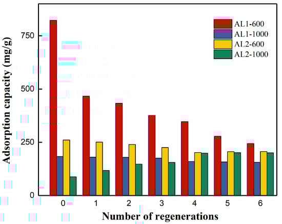 Due to its significance in cost reduction for practical applications, the recyclability of adsorbents was thoroughly investigated. The adsorption capacity of regenerated samples was compared with that of the pristine sample, as shown in Figure 11 and Table 6 and Table 7. AL1-600 exhibited the most pronounced reduction in specific surface area after six regeneration cycles, decreasing from 540.5 to 303.8 m2/g (a 43.8% decrease), with a corresponding adsorption capacity reduction to 244.4 mg/g (a 70.2% decrease). Conversely, AL2-600 demonstrated a 22.6% decrease in specific surface area after six cycles, from 686.2 to 530.8 m2/g, accompanied by a 20.7% decrease in adsorption capacity, from 183.3 to 156.0 mg/g. This reduction in adsorption capacity aligns with the decrease in specific surface area. These findings suggested that high-temperature regeneration significantly impacted both the specific surface area and adsorption capacity of AL1-600. Notably, the decline in adsorption capacity was substantially greater than the reduction in specific surface area, indicating that the adsorption sites on the surface were also adversely affected by the regeneration process. After silicon modification, the adsorption capacity of AL2-600 remained relatively stable, with only a slight decrease observed after multiple regeneration cycles at 600 °C.