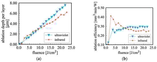 The type of glass significantly influences the efficiency of picosecond laser ablation, as different materials possess varying thermal properties, absorption characteristics, and chemical compositions. These factors impact the laser and glass interaction, resulting in different etching rates. Various glass materials have been examined to evaluate the effect of glass type on ablation efficiency, particularly concerning the ablation threshold, using a thin-crystal-disk laser system (tp = 10 ps, λ = 1030 nm, and dL = 10–19 μm) [97]. The thresholds of soda–lime glass, fused silica, sapphire, and borosilicate glass have been analyzed as indicators of ablation efficiency, demonstrating an evident reliance on the type of glass. The results showed that soda–lime and borosilicate glasses exhibited lower ablation thresholds of 9.54 and 9.40 J/cm2, respectively, compared to fused silica (11.02 J/cm2) and sapphire (13.05 J/cm2). This suggests that soda–lime and borosilicate glass display greater removal effectiveness than fused silica and sapphire at the same applied fluence [131].