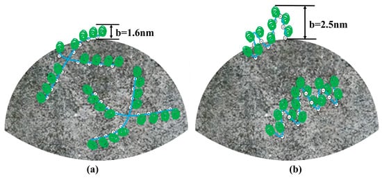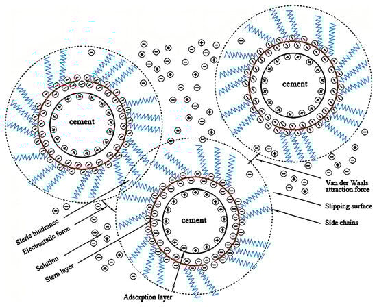 The higher the concentration of PCE, the more negative charges on the surface of the cement particles, which in turn enhances the electrostatic repulsion []. This leads to the disintegration of cement particles’ flocculated structure, releasing the free water trapped within the flocculated structure, and thus improving the fluidity of the cement paste. Meanwhile, some scholars believe that steric hindrance plays a role. When the main chain of PCE which has negative electric charges adsorbs on the surface of cement particles, the PEO side chains will extend into the pore solution, forming a polymer adsorption layer on the surface of cement particles. When cement particles approach each other, the polymer adsorption layers will overlap (see Figure 2). Then, steric hindrance will be formed which promotes the dispersion of cement particles [,]. Studies have shown that the steric hindrance effect mainly depends on the length and density of the side chains. When the length of the side chain of the PCE is increased and the side-chain density is higher, the steric hindrance effect becomes more pronounced, which in turn enhances the fluidity of the cement [,].