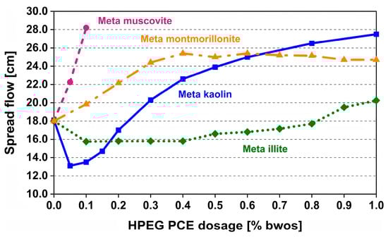 Dosage-dependent dispersing behavior of PCE sample in pastes prepared from the meta clay samples suspended in synthetic cement pore solution [].