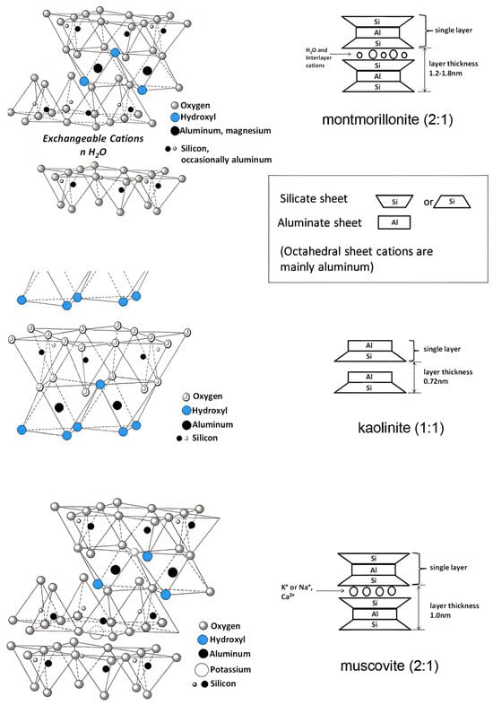 Clay minerals are natural materials composed of fine-grained minerals which are less than 2 microns in size. They are layered structured silicates composed of SiO4 tetrahedrons and AlO6 octahedrons []. Clay minerals are fundamentally classified as 1:1 or 2:1 phyllosilicates according to their layered crystal structures []. Representative clay minerals include kaolinite, muscovite, illite, and MMT.