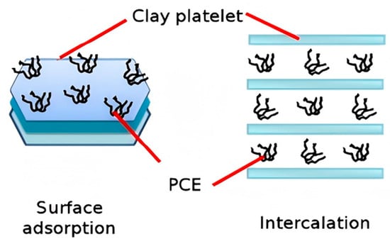 - Tan, H.; Gu, B.; Ma, B.; Li, X.; Lin, C.; Li, X. Mechanism of Intercalation of Polycarboxylate Superplasticizer into Montmorillonite. Appl. Clay Sci. 2016, 129, 40–46. [Google Scholar] [CrossRef]