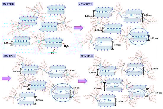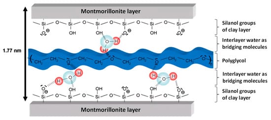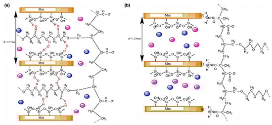 Another interaction mechanism involves chemical intercalation, which is particularly relevant for MMT due to its weak interlayer bonding and expandable 2:1 layered structure. When the water is added to the concrete, the H2O molecules will first enter the MMT interlayer, and the distance between the MMT layers will increase due to the entry of H2O molecules. Then, the polymer will enter the MMT interlayer. At this time, the O in the ether bond on the PCE side chain and the O on the MMT will bridge the H in the water molecules to form a hydrogen bond [], and further intercalate in the MMT interlayer (Figure 6). Ma et al. conducted XRD and adsorption tests for MMT with different concentrations of PCE []. They concluded that when the added amount of PCE was at a low concentration, it was mainly adsorbed on the surface of MMT. When the concentration of PCE increased, PCE was mainly adsorbed by inserting side chains into the interlayer of MMT.