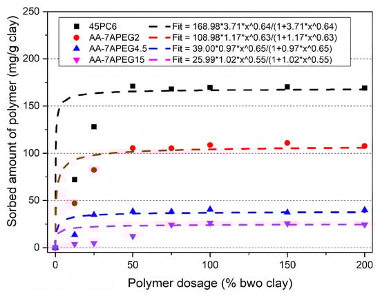 Sorption isotherms for various polymer samples with sodium bentonite dispersed in synthetic cement pore solution (pH = 13, solution/clay ratio = 48; the term A*B represents the multiplication between A and B) [].