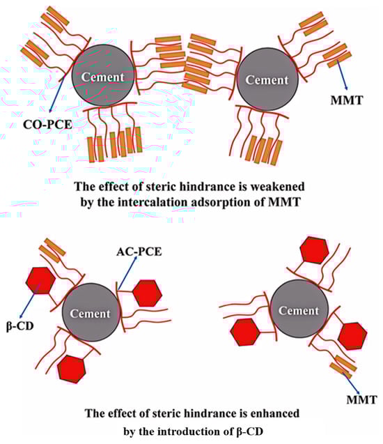 The steric hindrance of PCE can be effectively enhanced through strategic incorporation of bulky substituents into its side-chain structure. By design, the bulky substituents of PCE exceed the clay interlayer spacing, sterically blocking PEO intercalation and thereby enhancing clay resistance []. Yao et al. synthesized a PCE with a large polysaccharide structure side chain by introducing modified sodium alginate []. At 1.5% MMT content, conventional comb-type PCE yields a cement slurry fluidity of merely 18 cm, while the cement slurry containing modified sodium alginate PCE demonstrates significantly improved flowability (24 cm). Due to the steric hindrance caused by its large conformation size, the PEO side chain was prevented from being inserted into the MMT interlayer. Similarly, Li et al. grafted β-cyclodextrin (β-CD) in the traditional PCE side chain [] (as shown in Figure 8). The three-dimensional β-CD structure (maximum diameter: 1.53 nm) exceeds the MMT interlayer spacing, preventing intercalation and thereby enhancing PCE’s steric resistance to mitigate clay sensitivity. These results demonstrate that incorporating sterically hindered groups (e.g., polysaccharides or β-CD) into PCE side chains effectively mitigates clay sensitivity. This approach simultaneously enhances PCE dispersion in clay-contaminated cement systems and provides a viable pathway for developing high-performance, clay-tolerant PCEs.
