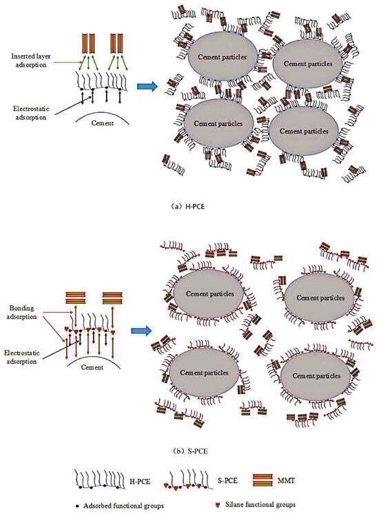 Anionic group incorporation has been widely employed as an alternative approach to reduce PCE’s clay sensitivity. The investigation centers on two key anionic groups. The first is the anionic group containing the sulfonic acid group. Guo et al. introduced 2-acrylamyl-2-methylpropanesulfonic acid (AMPS) into the PCE side chain []. Systematic increase in the AMPSA/HPEG molar ratio (0.1:1 baseline) improved MMT-contaminated paste flowability by 22% (from 135 mm to 165 mm). This enhancement originates from the sulfonate groups in AMPS, which preferentially adsorb onto MMT surfaces, generating electrostatic repulsion that simultaneously prevents PCE intercalation into the clay interlayers. So this way is conducive to inhibiting the clay sensitivity. Wang et al. developed an anti-clay S-PCE by incorporating γ-methacryloyloxypropyltrimethoxysilane (KH570) []. XRD analysis revealed that the MMT interlayer spacing expanded by 0.53 nm in the HPEG-PCE solution but only 0.03 nm in the S-PCE solution, demonstrating significantly suppressed intercalation. The silanol groups (Si-OH) in S-PCE dehydrate and bond to the silanol on the surface of the MMT, promoting surface adsorption over interlayer insertion (Figure 9). This mechanism effectively blocks PEO side-chain intercalation, preventing clay-induced performance degradation [,]. Furthermore, Li et al. improved both main-chain rigidity and PCE spatial extension through the incorporation of the clay-resistant sodium methylpropylene sulfonate group, while optimizing the raw material ratios []. The synthesized PCE has good workability with cement mortar containing MMT.