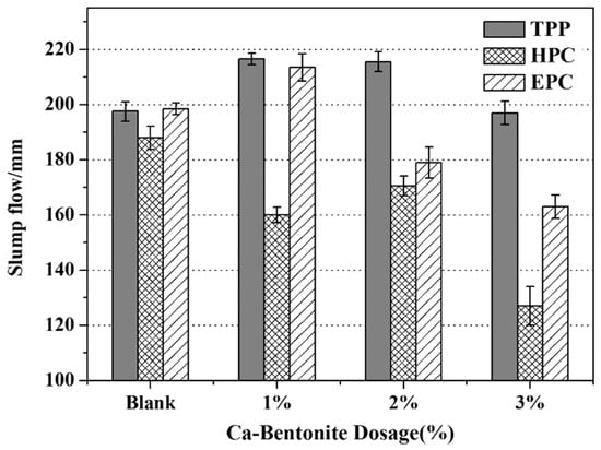 In addition to sulfonic acid groups, Zhang et al. designed a phosphonate-modified PCE (PHS-PCE) []. In clay-containing systems, PHS-PCE demonstrated superior adsorption stability with only an 18% reduction in cement adsorption capacity, while conventional PCE showed a 25% reduction. The phosphonate groups in PHS-PCE preferentially adsorb onto clay particle edges, effectively blocking PCE intercalation and thereby mitigating the clay sensitivity of PCE. Similarly, Feng et al. introduced phosphate groups as side chains into TPEG-PCE to prepare a clay-tolerant PCE (TPP) []. When containing 1% clay, TPP yielded mortar fluidity of 218 mm, substantially exceeding HPEG-PCE’s performance (160 mm) at equivalent dosages (Figure 10). Only when the dosage of HPEG-PCE was increased by approximately 20% did the initial fluidity of the mortar approach that of TPP, demonstrating TPP’s superior clay tolerance and dispersion stability.