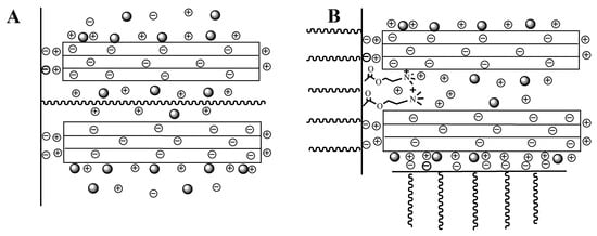 Interaction mechanism between APC and sodium bentonite. ((A)—for PCE and (B)—for APC) [].
