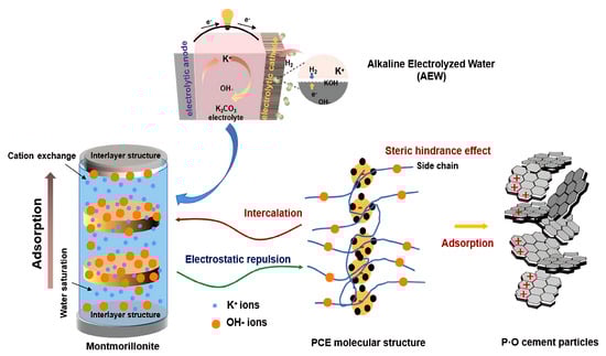 Gómez et al. demonstrated a positive correlation between molecular weight and clay surface adsorption capacity for quaternary amine sacrificial agents []. This adsorption significantly reduces the specific surface area of the clay. Similarly, Li et al. demonstrated that using alkaline electrolyte water (AEW) instead of ordinary tap water during cement hydration can increase the surface charge density of cement particles []. MMT exhibits an 89% adsorption rate to PCE superplasticizer in tap water within one hour, decreasing to 72% in AEW. The highly active metal cations in AEW adsorb onto the surface of cement, enhancing the adsorption of PCE. In the presence of clay, these cations preferentially intercalate into the interlayer structure of the clay until reaching saturation (Figure 15). This process alleviates the chemical intercalation effect of PCE side chains, thereby achieving an anti-clay effect to prevent clay-induced fluidity loss.