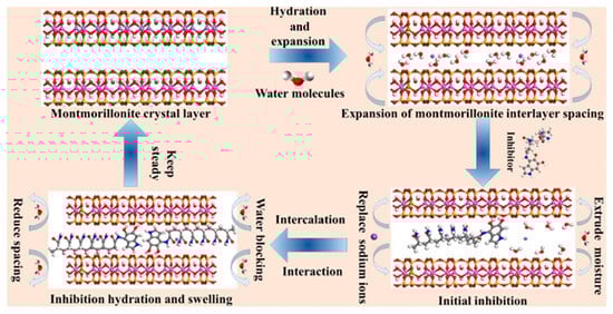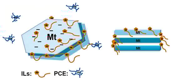 Due to the high swelling rate and hydrophilicity of MMT, the water reduction efficiency of PCE is seriously hindered. Therefore, the swelling rate of MMT can be reduced and hydration can be prevented by adding clay swelling inhibitor, so as to isolate the interaction between PCE and MMT [,]. Ionic liquids (ILs) are organic molten salts composed of organic cations and inorganic/organic anions. He and coworkers synthesized a series of ionic liquids as sacrificial agents containing different long-chain imidazolium-based cation and anion to apply to cement paste with MMT []. As shown in Figure 16, ILs have a stronger ability to interact with MMT and can be preferentially absorbed by MMT compared with PCE. The addition of ILs composed of different long-chain imidazolium-based cation and different anions could increase tolerance for clay of PCE, making PCE more compatible in cement paste containing clay, improving the fluidity of cement–MMT paste significantly by 70%.