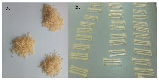 Physical pictures of the synthesized nanocomposites: (a) after extrusion and granulation and (b) after injection molding.