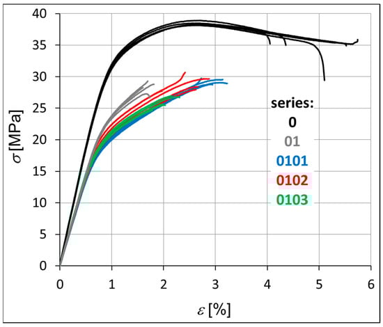 The results indicate that the unmodified P3HB (series 0) can be classified as a rigid material exhibiting a distinct yield point (σy). In this case, the yield strength equals the ultimate tensile strength (σy = σM). In contrast, the materials from the modified series do not exhibit a clearly defined yield point according to the relevant standards, and thus for these materials, the strength at break is considered equivalent to the maximum stress (σB = σM).