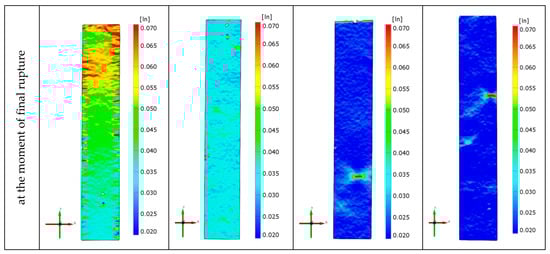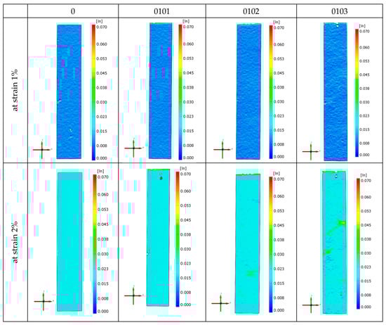 Figure 6 shows the strain fields of exemplary specimens of the investigated material obtained in monotonic tensile tests using the Aramis 3D 4M vision system. The distributions of the strain field in the entire measuring part of the sample are presented here for the relative strain ε of 1% and 2%, as well as just before the sample breaks. In the case of ε = 1%, the distribution of the strain field in the entire area of the specimen gauge length is uniform. For ε = 2%, it can be seen that the heterogeneity of the mentioned distributions increases with the increase in the percentage of organic clay in the P3HB–PU matrix. This heterogeneity appears in places where the pores are located close to the specimen wall. In such cross-sections, the final rupture of the specimen usually occurs. In the case of the native P3HB (series 0), numerous small micro-cracks are visible on the specimen surface.