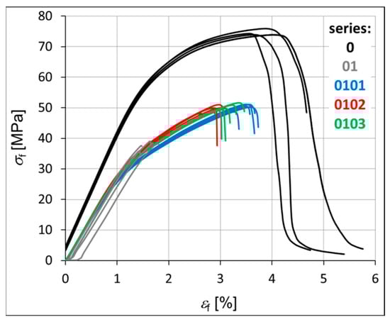 The prepared nanobiocomposites were also tested in three-point bending. The aim of the test was to determine modulus of elasticity Ef; bending strength σfM, and the corresponding strain εfM; and stress at failure σfB, and the corresponding strain εfB. The test results of the three-point bending are summarized in Table 5 and in Figure 7 to the relevant standard. Table 3 shows the average values of strength parameters obtained for five specimens. The value of the standard deviation (s) is shown in brackets next to the parameter value. The native P3HB belongs to the group of materials showing the maximum stress σf during the bending test and cracking before reaching conventional deflection sC. In turn, the standard classifies materials from series 01, 0101, 0102, and 0103 as materials rupturing before plastic strain and then σfM = σfB. The values of the longitudinal modulus of elasticity E determined in monotonic tensile tests and three-point bending tests coincide (Table 4 and Table 5). The stress at break σfB for material series 01, 0101, 0102, and 0103 remain at an almost identical level of 50 MPa, while for the base material (series 0) it is much higher. The strain at break εfB is the largest for the base material. It decreases for material series 0101, 0102, and 0103 with increasing percentage of organic clay. We can observe a similar situation in tensile tests.