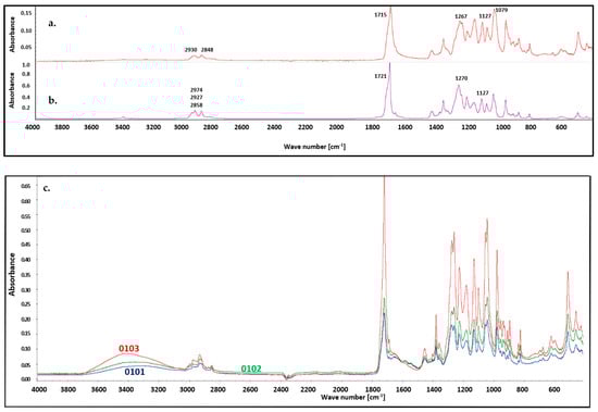 FT IR spectra of P3HB: (a) after biodegradation, (b) before biodegradation, and (c) hybrid nanobiocomposites with 1, 2 and 3% by mass of Cloisite 30B, series 0101, 0102, and 0103, respectively, conducted after biodegradability the tests.