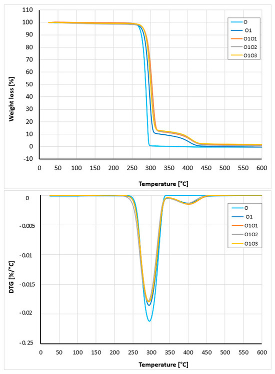 Interpretation of TG and DTG curves of P3HB (0), its biocomposition with PU (01), and their nanobiocomposites with 1, 2, and 3% by mass of Cloisite®30B (0101, 0102, and 0103) obtained at a heating rate of 5 °C/min under a nitrogen atmosphere. Values of glass transition temperatures and melting points of the tested materials were determined from DSC measurements.