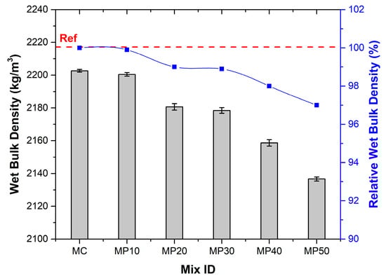 Figure 3 illustrates the decreasing trend in wet bulk density (WBD) as the replacement of OPC with OPA increases. The reference mixture MC recorded the highest wet bulk density (2202 kg/m