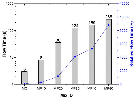 31]. Nonetheless, up to 10% OPA replacement (MP10) showed only a marginal increase in FT compared to MC. While ASTM C1437 does not specify minimum or maximum flow time requirements, practical construction applications typically recommend flow times between 15 and 60 s for adequate workability and placement efficiency, indicating that OPA replacements beyond 20% may present workability challenges in field applications.