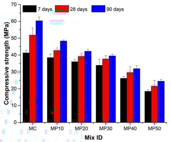 The control mix achieved maximum strengths of 6.45 MPa (7 days), 6.80 MPa (28 days), and 7.45 MPa (90 days), while MP50 exhibited only 2.90 MPa at 90 days (FS90). This reduction is linked to decreased C–S–H gel formation and increased porosity [