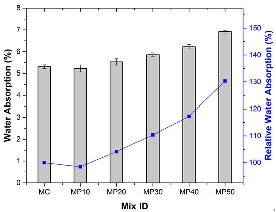 19]. MP40 and MP50 recorded the highest absorption, reflecting the diminished microstructural compactness at elevated OPA dosages. The high angularity and surface roughness of OPA also increase pore interconnections [