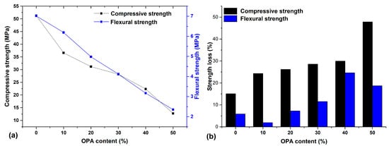 Figure 6 demonstrates that flexural strength followed a trend similar to compressive strength, declining as the OPA content increased.