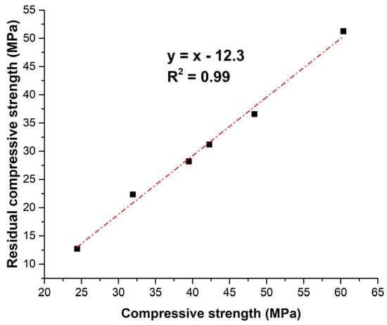 Figure 11 displays the linear relationship between the residual compressive strength after 300 freeze–thaw cycles and the CS90 before exposure (Equation (3)).