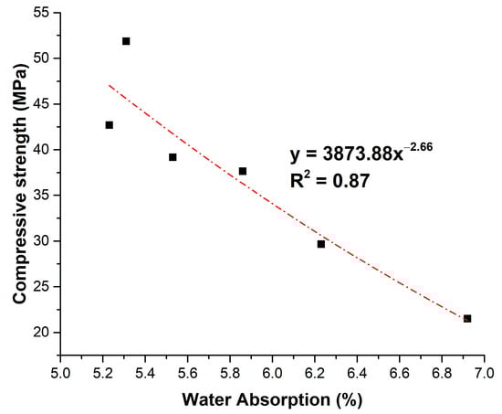 The square correlation coefficient R2 = 0.87 indicates a good fit of the findings with CS28 in MPa. The relationship demonstrates that small gains in compressive strength corresponded to disproportionately large reductions in WA. This supports the notion that moderate OPA incorporation can refine pore structure and reduce permeability, although excessive replacement increases porosity and weakens the matrix. Tailoring the OPA content to balance pozzolanic pore refinement and porosity addition is critical.