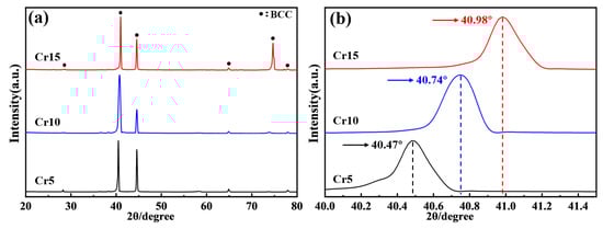 Figure 1 shows the XRD patterns of AlTiVCr alloys. As shown in Figure 1a, only the diffraction peaks of body—center—cubic (BCC) structure could be observed in the XRD patterns of all tested AlTiVCr alloys. A further observation of the diffraction peaks (shown in Figure 1b) indicates that the center position of the most intensive diffraction peak of AlTiVCr alloy gradually shifts to the right with the increase of Cr content. Specifically, it increased from 40.47° for Cr5 to 40.74° for Cr10 and 40.98° for Cr15. It was mainly attributed that the atomic radii of Al, Ti, V and Cr were 0.1434, 0.1445, 0.1311 and 0.1249 nm, respectively. Cr has the smallest atomic radius of the four elements. As a result, the lattice constant of the solid solution decreases due to the increase of Cr content, thereby causing a decrease in the crystal plane spacing. Therefore, based on the Bragg’s equation [24], the diffraction peaks of AlTiVCr are shifted to the high angle with the increasing Cr content.