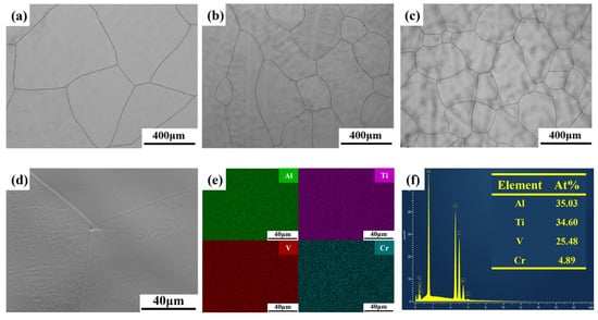 Figure 2 presents the microstructure’s OM and EDS characterization of AlTiVCr alloys. As shown in Figure 2a–c, the grains of all three AlTiVCr alloys are equiaxed without precipitates being observed. Statistics indicates that the grain size of AlTiVCr alloy decreases gradually with increasing Cr content from 486.7 μm for Cr5 to 367.3 μm for Cr10 and 308.4 μm for Cr15. The EDS characterization of Cr5 in Figure 2d,e exhibits a uniform distribution of Al, Ti, V, and Cr elements, with no compositional segregation. The composition of Cr5 is also consistent with the designed values in Table 1. In fact, the compositions of Cr10 and Cr15 are also similar to the designed values. It further confirms that there was no significant burning loss of the alloying elements during their preparations.