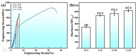 Mechanical behavior of tested materials: (a) compressive stress-strain curves, (b) Vickers hardness, and indentation SEM images of (c) TC4, (d) Cr5, (e) Cr10, and (f) Cr15.