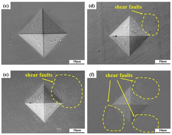 Figure 3 illustrates the characterization of the mechanical behavior of TC4 and AlTiVCr alloys. The compressive stress-strain curves (Figure 3a) and the hardness (Figure 3b) show that the AlTiVCr alloy is much harder than TC4, but with a lower fracture strain. Moreover, the hardness of AlTiVCr alloys gradually increases but its elongation gradually decreases with increasing Cr content. To be specific, the hardness/fracture strain of TC4, Cr5, Cr10 and Cr15 were346 HV0.2/36.8%, 537.5 HV0.2/6.7%, 572.3 HV0.2/5.6%, 617.6 HV0.2/3.8%. The indentation morphology in Figure 3c–f suggests that no significant changes are observed in the microstructure around the indentation of TC4. In contrast, a large number of shear faults can be seen around the indentation of AlTiVCr alloy. Moreover, the number of shear faults increases gradually with the increase of Cr content. More shear faults indicate that the material has a poor toughness and a weak resistance to fracture. Therefore, the indentation morphology also indicates that the toughness of AlTiVCr alloy is lower than that of TC4 and decreases gradually with the increase of Cr content.