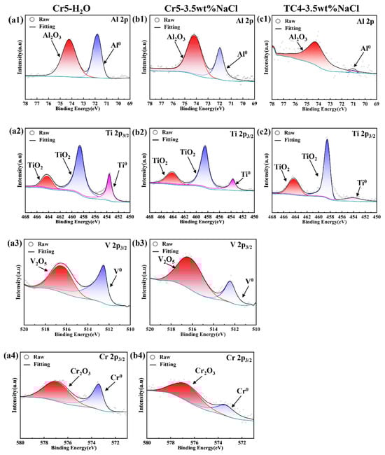XPS spectra: (a1–a4) Cr5 immersed in the deionized water, (b1–b4) Cr5 immersed in the 3.5 wt.% NaCl solution, and (c1,c2) TC4 immersed in the 3.5 wt.% NaCl solution.