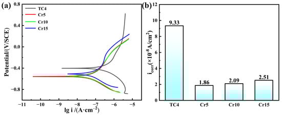 Figure 5 shows the electrochemical corrosion behavior of AlTiVCr and TC4 in the 3.5 wt.% NaCl solution. As shown in the kinetic potential polarization curves of Figure 5a, the corrosion current density of TC4 in the anodic polarization zone was not significantly increased with the increasing potential, which indicates the occurrence of passivation behavior. However, no passivation behaviors were exhibited by the AlTiVC alloys. Then, it could be deduced that the oxidized film on the surface of TC4 is more stable than that of AlTiVCr alloys. However, as shown in Figure 5b, the calculated corrosion current densities of Cr5, Cr10, and Cr15 are 1.86 × 10−8, 2.09 × 10−8, 2.51 × 10−8 A/cm2, which are all smaller than that of TC4 (9.33 × 10−8 A/cm2). The corrosion resistance of AlTiVCr alloys is more excellent than that of TC4, but it decreases with the increase of Cr content.