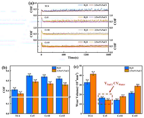 COF: It increases sharply at the initial stage of the wear test due to the occurrence of adhesive wear for the removal of the oxidized layer on the surface, and then decreases to a steady state due to the formation of oxides. It can be concluded that the oxides on the worn surface have a lubricating function, thereby reducing the COF. From the corrosion behavior, it can be seen that TC4 is more prone to form a thick oxidized layer compared to (AlTiV)100−xCrx. Therefore, the maximum COF of TC4 at the initial stage of the wear test is much lower than that of (AlTiV)100−xCrx. Furthermore, the COF of (AlTiV)100−xCrx decreases with increasing Cr content as well as the solution corrosivity for their promoting on the oxide’s formation.